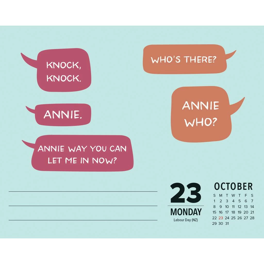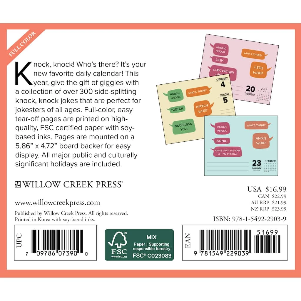 Knock, knock! Whoβs there? Itβs your new favorite daily calendar! This year, give the gift of giggles with a collection of over 300 side-splitting knock-knock jokes that are perfect for jokesters of all ages. This calendar includes all major public and culturally significant holidays.