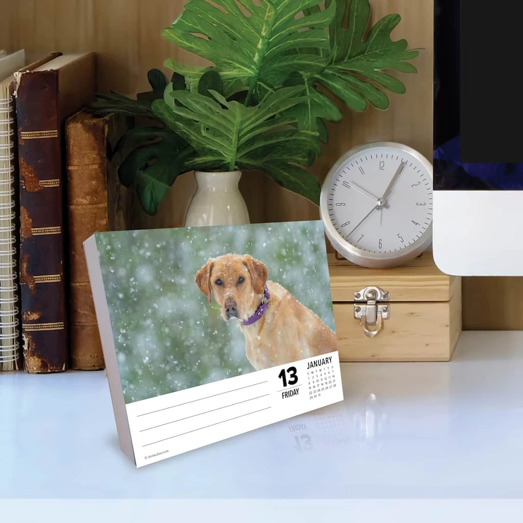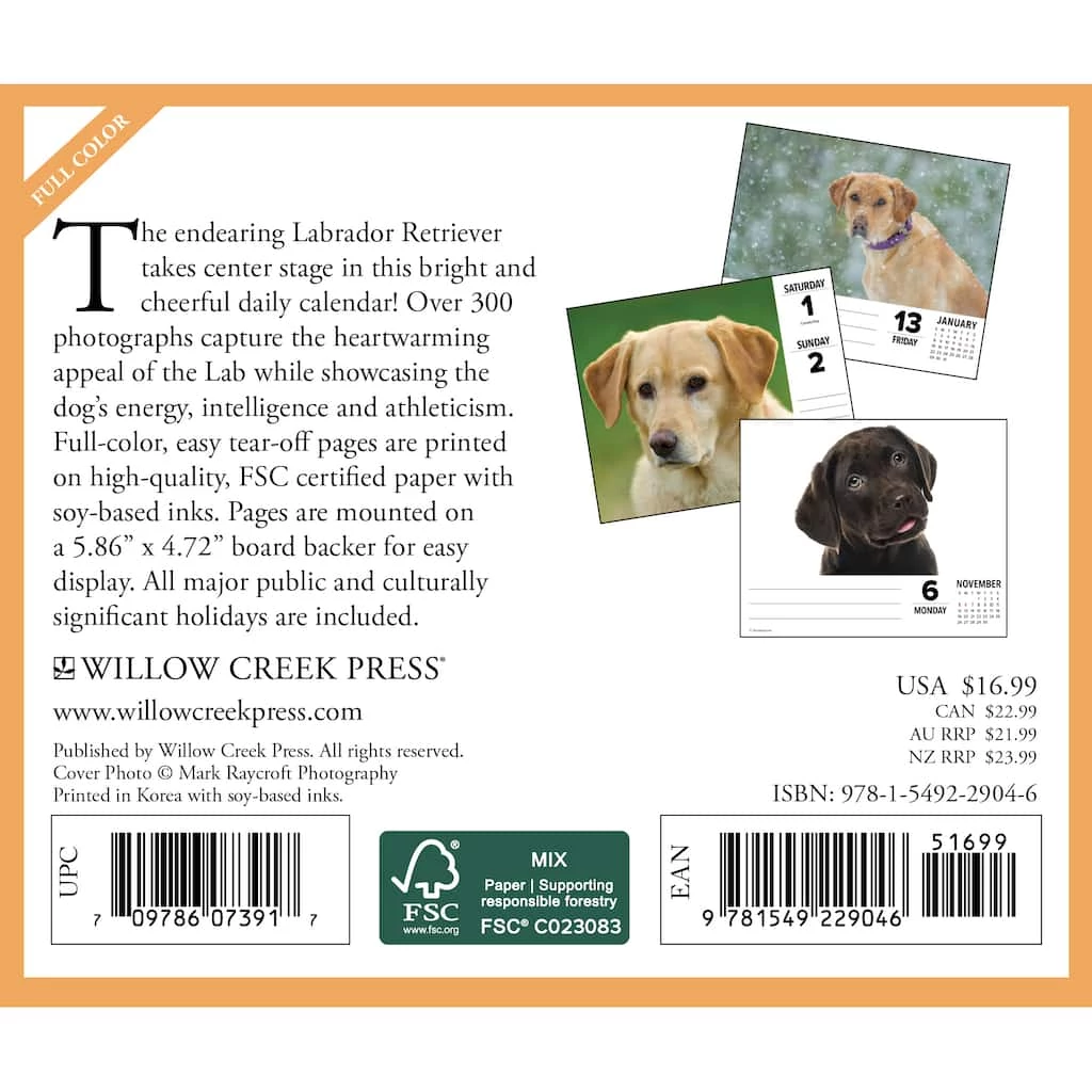 The endearing Labrador Retriever takes center stage in this bright and cheerful daily calendar! Over 310 full-color photographs capture the heart-warming appeal of the Lab. Whether showcasing the dog’s energy, intelligence, athleticism, or fun-loving nature, these images are sure to brighten each day of your new year! All major public and culturally significant holidays are included.