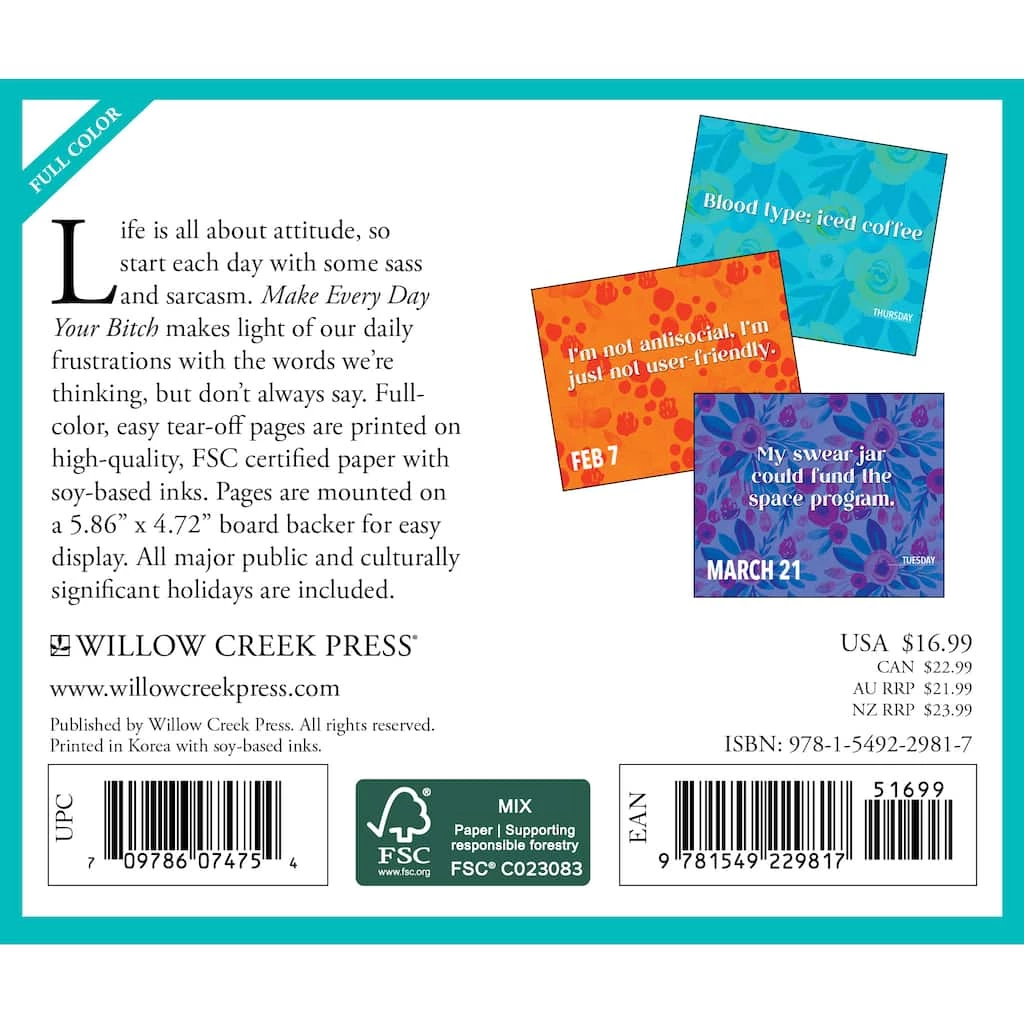 Life is all about attitude, so start each day with a full cup of sass and a side of sarcasm. Make Every Day Your Bitch makes light of our daily frustrations with the words that we think, but donβt always say. All major public and culturally significant holidays are included.