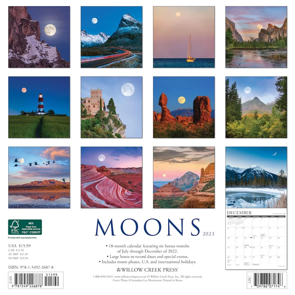 Dramatic photographs from throughout the earth depict our planetβs sole and silent satellite, the moon, as it glides over the oceans, affecting our tides, and across the continents, evoking our awe and inspiration. Printed with soy-based inks on FSC certified paper, this 12″ x 12″ wall calendar features large monthly grids that offer ample room for jotting notes, along with six bonus months of July through December of 2022. Also includes moon phases (CST), standard U.S. and international holidays.