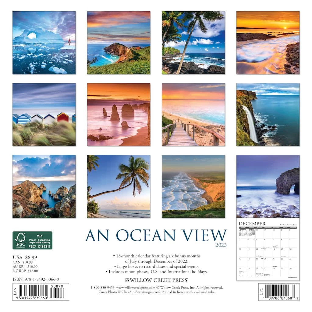“The sea pronounces something, over and over, in a hoarse whisper,” wrote Annie Dillard, “I cannot quite make it out.” Watch the ocean’s magnificent seascapes and hear it talk to you as well. Printed with soy-based inks on FSC certified paper, this 7″ x 7″ wall calendar features monthly grids that offer ample room for jotting notes, along with six bonus months of July through December of 2022. Also includes moon phases (CST), standard U.S., and international holidays.