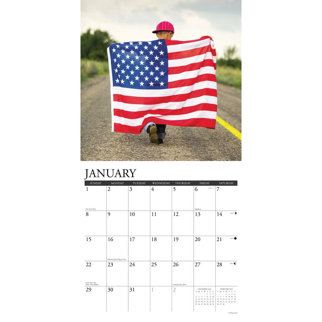 Our great flag flies on the porches of American homes, atop magnificent skyscrapers, over solemn cemeteries, and stands silent vigil on the moon.Β This twelve month tribute to Old Glory features the flag flying proudly throughout the U.S.A. Β Join the celebration!Β Printed with soy-based inks on FSC certified paper, this 12″ x 12″ wall calendar features large monthly grids that offer ample room for jotting notes, along with six bonus months of July through December of 2022. Also includes moon phases (CST), standard U.S. and international holidays.