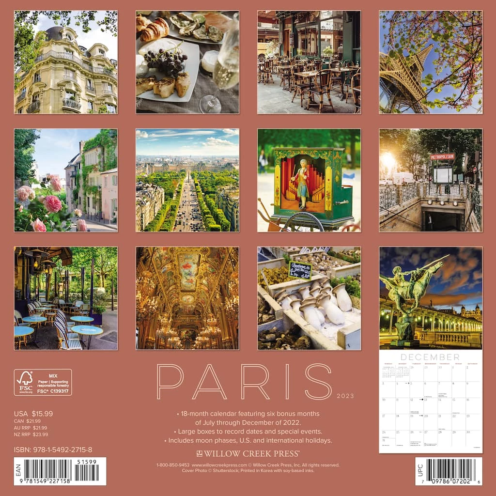Francophiles will delight in this ode to romance and ambiance of the incomparable City of Light. Amble down cobblestone lanes of Montmartre, gaze upon the iconic Eiffel Tower, or take in the culinary delights at a corner café or patisserie. Printed with soy-based inks on FSC certified paper, this 12″ x 12″ wall calendar features large monthly grids that offer ample room for jotting notes, along with six bonus months of July through December of 2022. Also includes moon phases (CST), standard U.S. and international holidays.