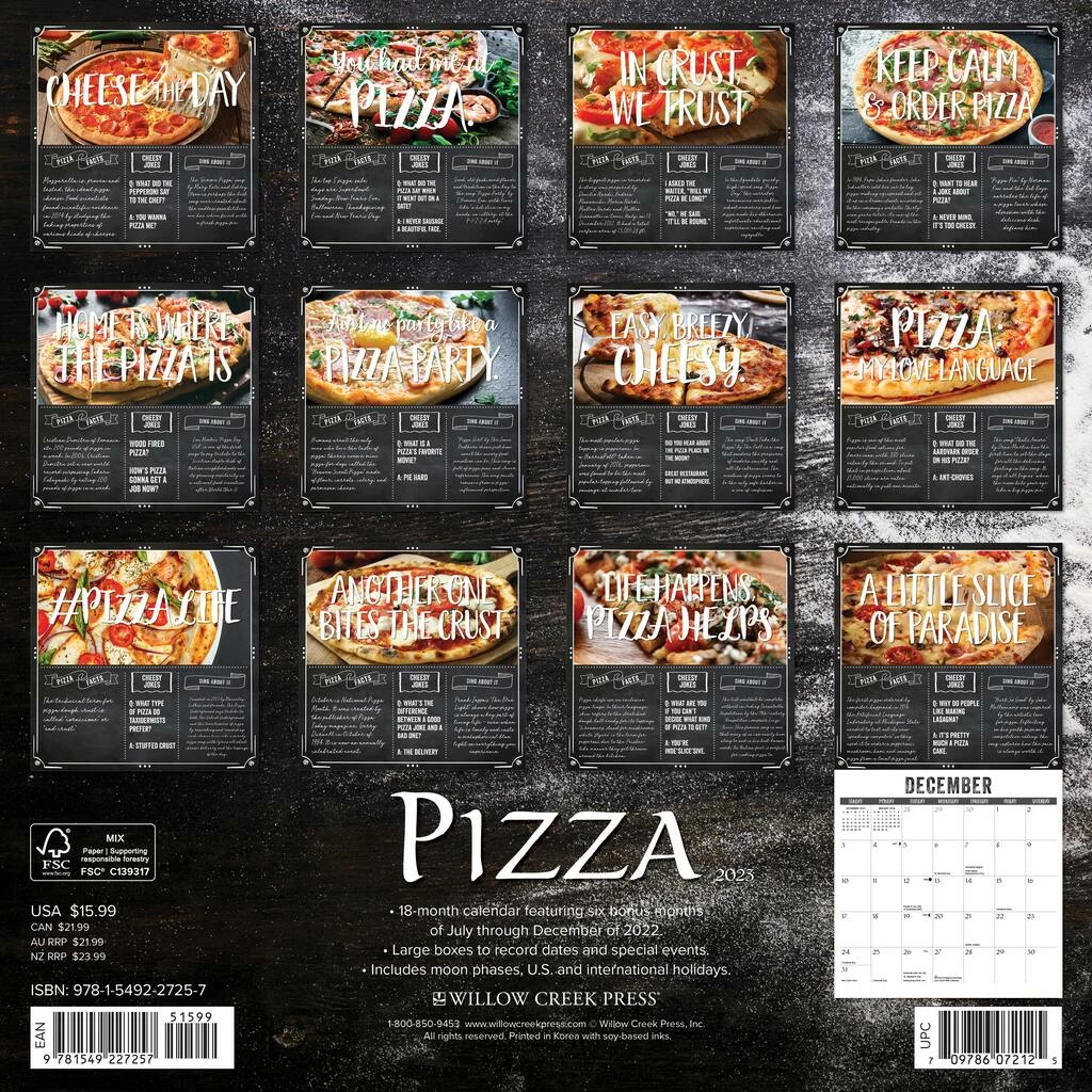 Pizza lovers rejoice, this pie for you. Whether itβs a big foldable slice from NYC or a bottomless deep-dish from Chicago, youβd be hard-pressed to find anyone that doesnβt have an opinion on their favorite ‘za. This deluxe wall calendar is layered with tasty tidbits and melty, mouth-watering photos. If you werenβt hungry before, you will be now. Printed with soy-based inks on FSC certified paper, this 12″ x 12″ wall calendar features large monthly grids that offer ample room for jotting notes, along with six bonus months of July through December of 2022. Also includes moon phases (CST), standard U.S. and international holidays.