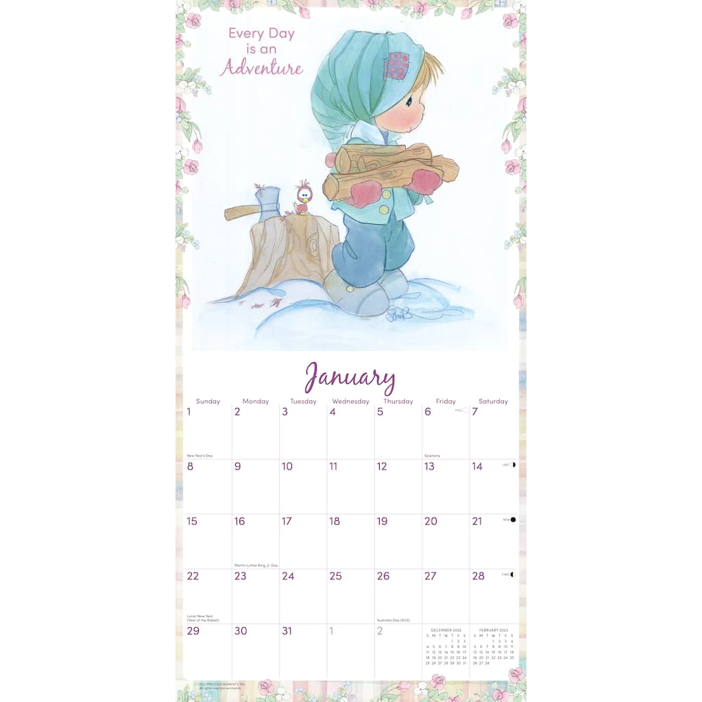 With their teardrop-eyed, angelic faces, the adorable Precious Moments children have touched the hearts of millions around the world in the form of collectibles, ornaments, and figurines. Printed with soy-based inks on FSC certified paper, this 12″ x 12″ wall calendar features large monthly grids that offer ample room for jotting notes, along with six bonus months of July through December of 2022. Also includes moon phases (CST), standard U.S. and international holidays.