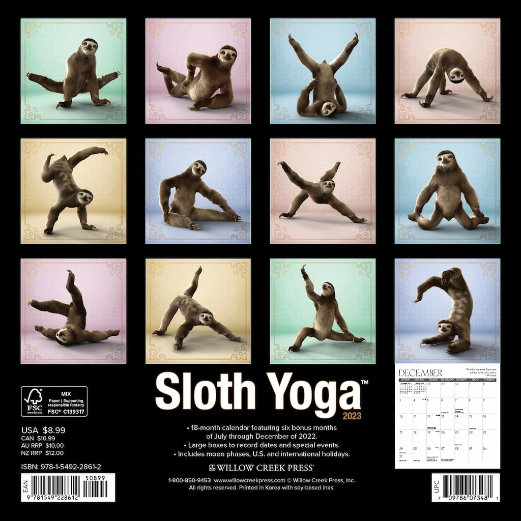 These sloth yogis are in no rush to complete their 2023 yoga sequence, often taking an entire month just to complete a single pose. Sloth Yoga takes this popular meditative practice to a new level of zen. Printed with soy-based inks on FSC certified paper, this 7″ x 7″ wall calendar features large monthly grids that offer ample room for jotting notes, along with six bonus months of July through December of 2022. Also includes moon phases (CST), standard U.S., and international holidays.