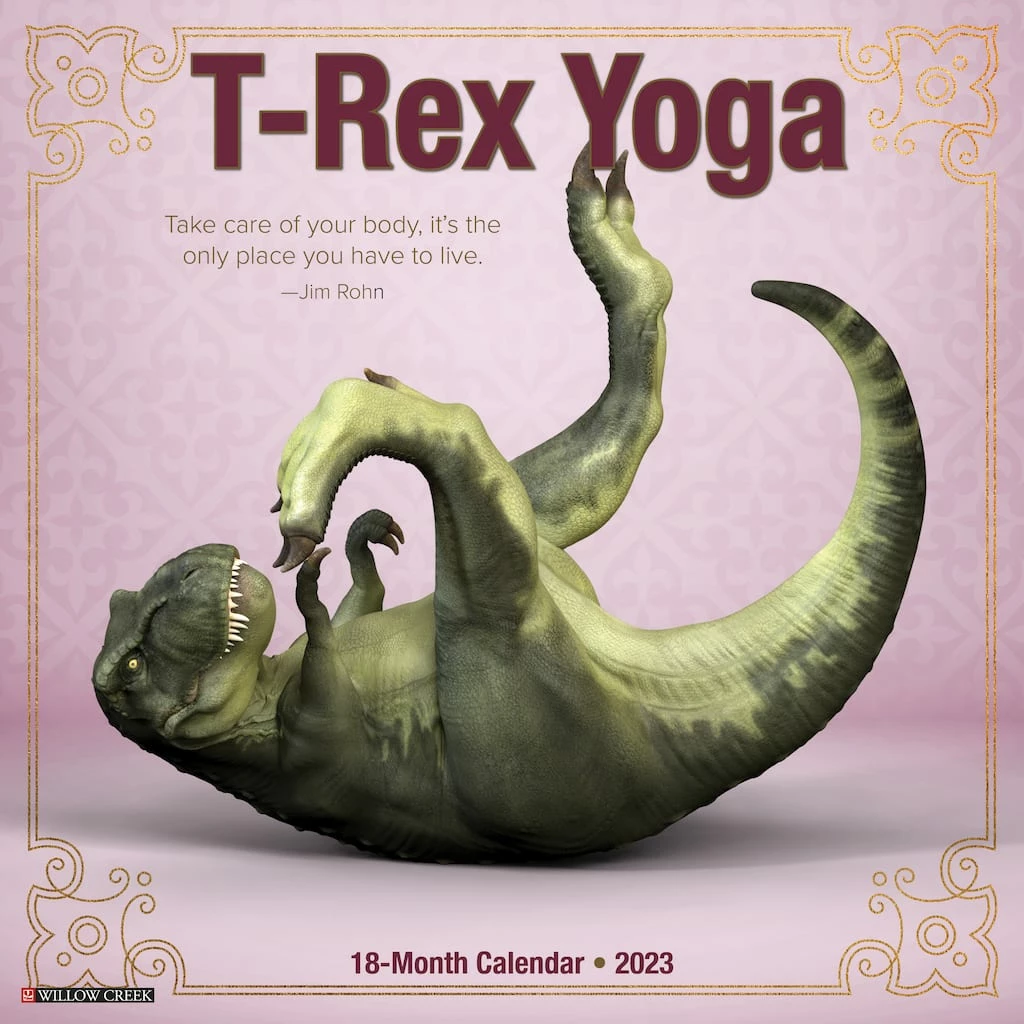 Any T-Rex yogi knows that the difference between try and triumph is a just little umph. Behind those banana-sized razor sharp teeth and itty bitty arms is a mindful, sensitive creature that values balance above all. Sometimes a tyrant lizard king just needs to breathe and connect with its innermost self. Printed with soy-based inks on FSC certified paper, this 12″ x 12″ wall calendar features large monthly grids that offer ample room for jotting notes, along with six bonus months of July through December of 2022. Also includes moon phases (CST), standard U.S. and international holidays.