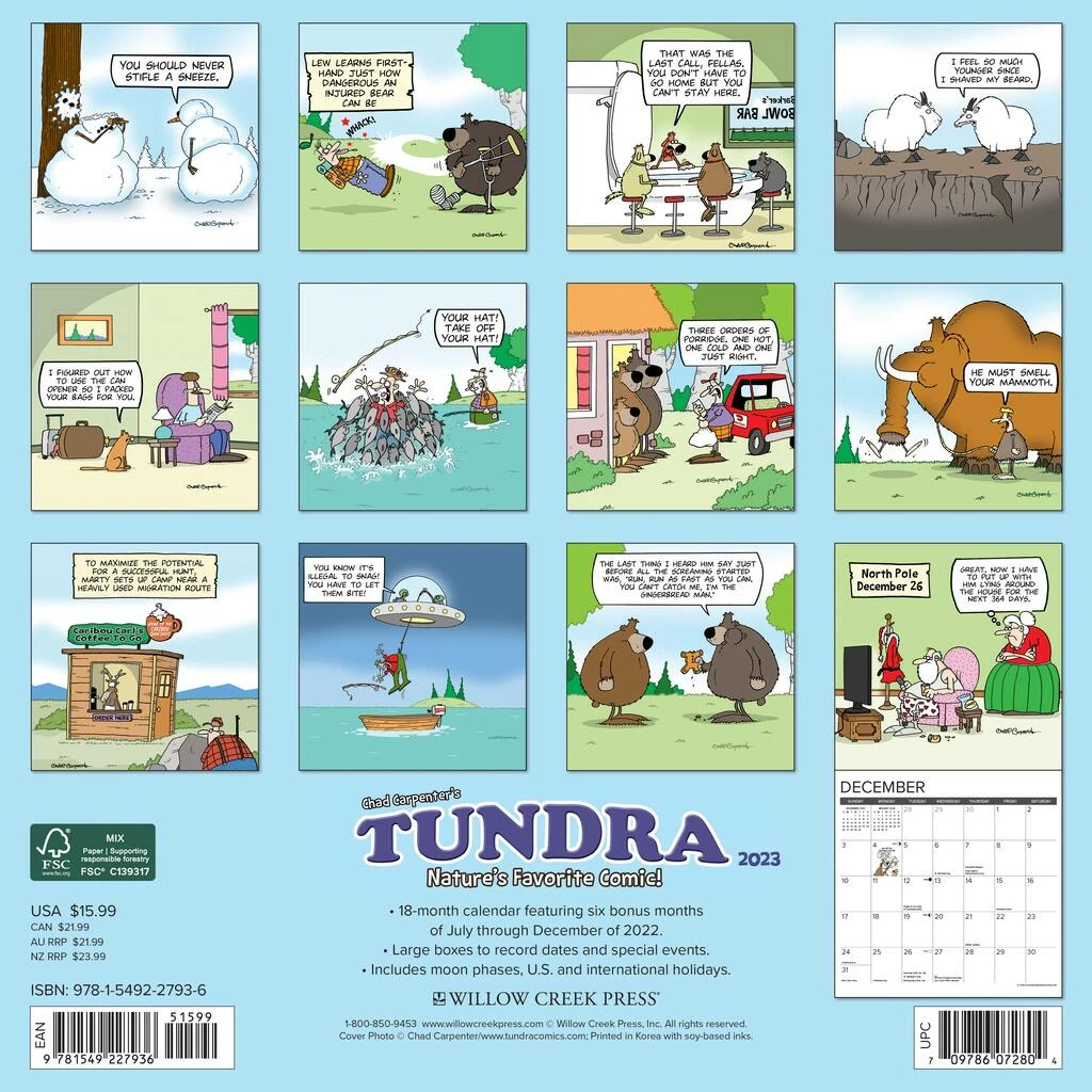 Tundraβthe comic strip Mother Nature warned you aboutβis syndicated in nearly 500 newspapers throughout the U.S., Canada and Europe. Chad Carpenter chose 12 of his favorite full-color cartoons, “hand-picked for funniness,” featuring hilarious man vs. animal encounters in the Alaskan wilds. Printed with soy-based inks on FSC certified paper, this 12″ x 12″ wall calendar features large monthly grids that offer ample room for jotting notes, along with six bonus months of July through December of 2022. Also includes moon phases (CST), standard U.S. and international holidays.