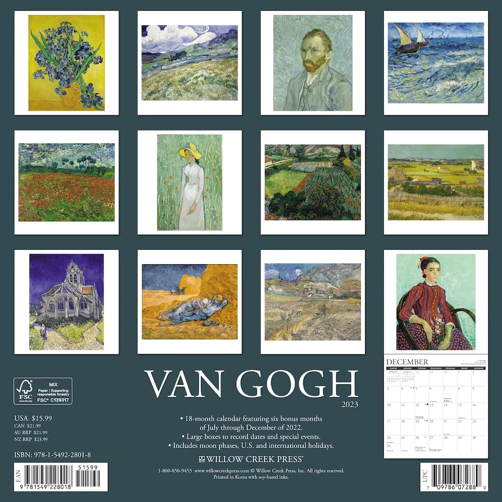 The artwork that Vincent van Gogh is famous for was made in a tempest of creativity; a manic, impassioned decade that resulted in extensive output at great personal cost. The artist struggled most of his life with depression and madness, aspiring to create beauty which would, in turn, inspire happiness around the world. From The Potato Eaters to Sunflowers, and The Bedroom to Starry Night, Vincent van Gogh will forever be viewed as the father of Post-Impressionism. Printed with soy-based inks on FSC certified paper, this deluxe wall calendar features large monthly grids that offer ample room for jotting notes, along with six bonus months of July through December of 2022. It also includes moon phases (CST), standard U.S. and international holidays.