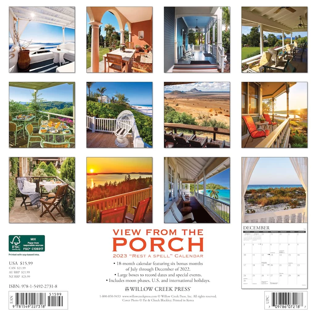 Itβs time to pour yourself a glass of lemonade and spend some time on the old porch swing. Enjoy a yearsβ worth of tranquil porch views with these twelve full color photographs. Printed with soy-based inks on FSC certified paper, this 12″ x 12″ wall calendar features large monthly grids that offer ample room for jotting notes, along with six bonus months of July through December of 2022. Also includes moon phases (CST), standard U.S. and international holidays.