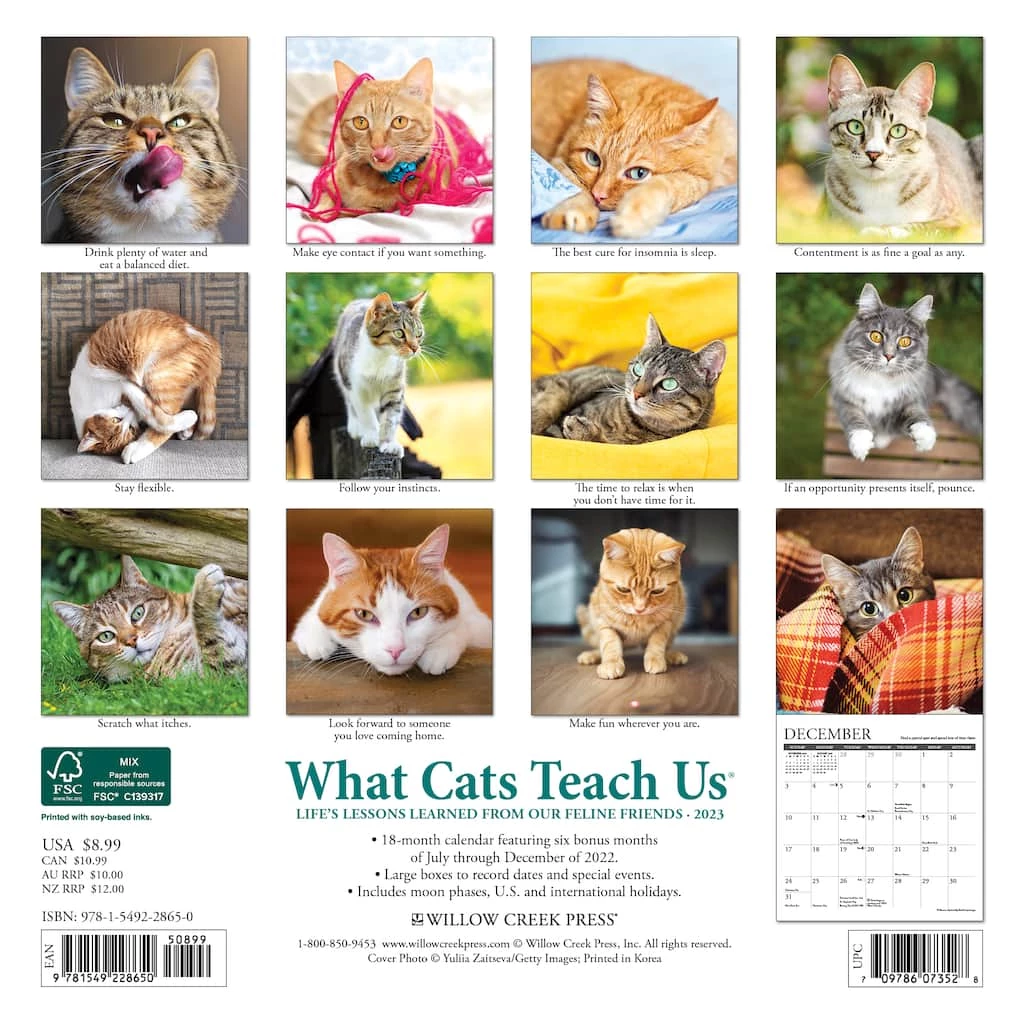 Twelve full-color cat photographs each paired with a monthly lesson teach us what things in our human lives are important to cherish, defend and avoid.ย Printed with soy-based inks on FSC certified paper, this 7″ x 7″ wall calendar features large monthly grids that offer ample room for jotting notes, along with six bonus months of July through December of 2022. Also includes moon phases (CST), standard U.S., and international holidays.