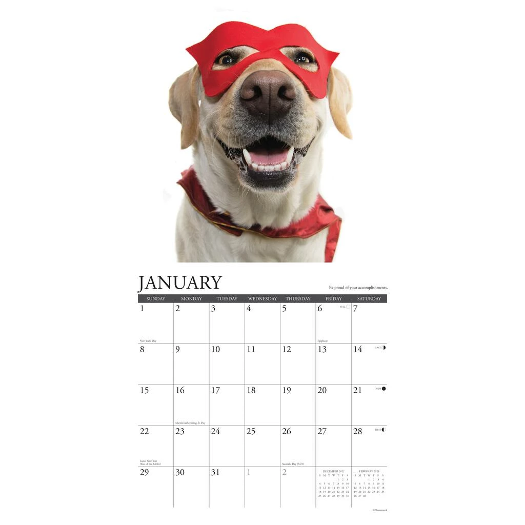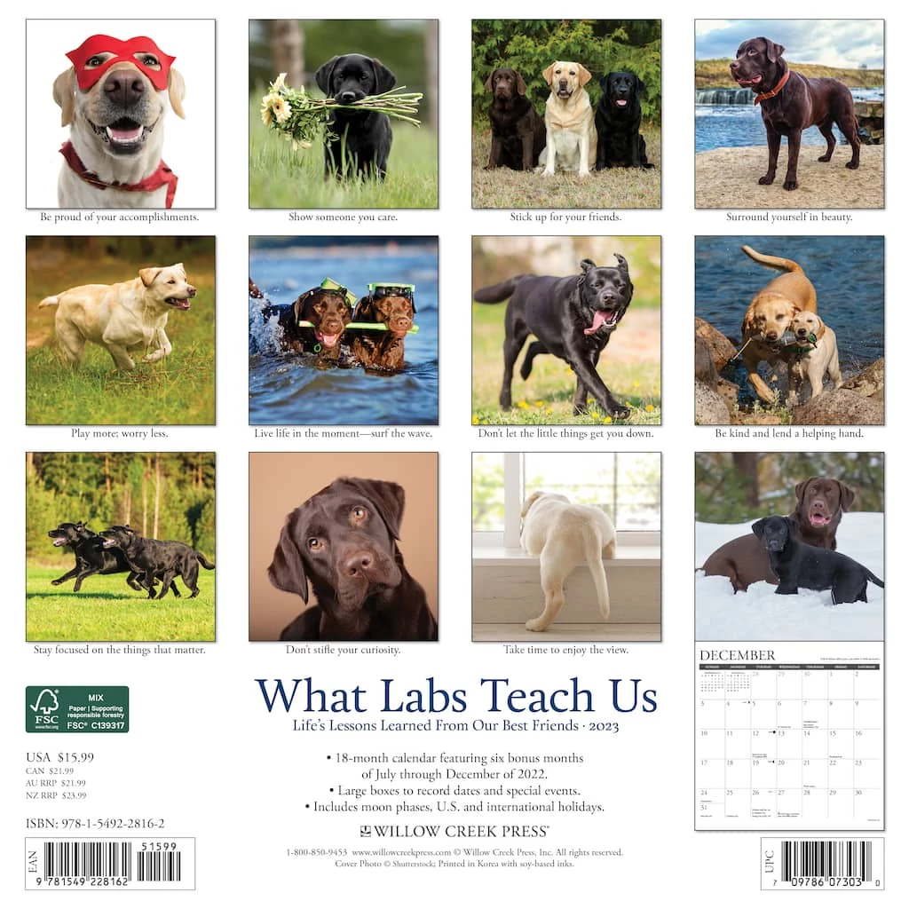 Labs have an innate understanding of the joys of life that make us happy just being around them. Delightful full-color photographs are paired with Lab life lessons to help us better appreciate and understand the gift of being alive. Printed with soy-based inks on FSC certified paper, this 12″ x 12″ wall calendar features large monthly grids that offer ample room for jotting notes, along with six bonus months of July through December of 2022. Also includes moon phases (CST), standard U.S. and international holidays.