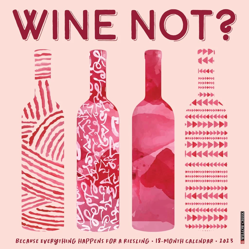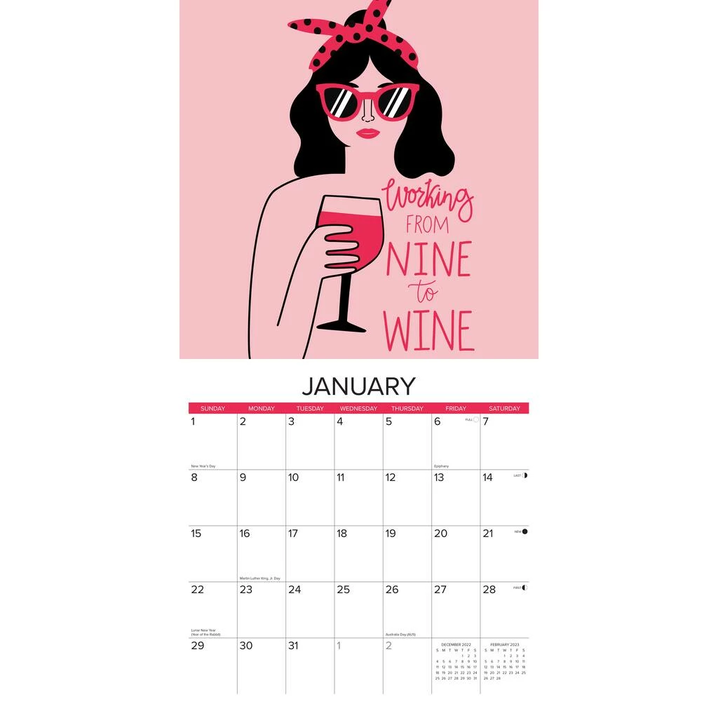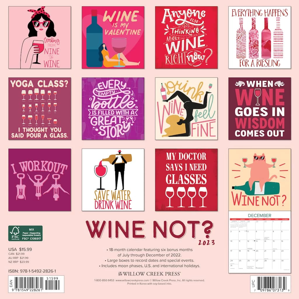Life is short, so Wine Not! The witticism of this wine-centric calendar is sure to charm you. Illustrated quips inspired by your favorite crisp white, a blushing rosΓ©, or jammy red talk about the joys of imbibing with friends, sneaking a glass of mom juice in the pantry, and prioritizing life choices like saving your carbs for wine. Not the least bit complex, with a long, lingering finish, each month will make you smile and appreciate the miracle born of the simple grape. Printed with soy-based inks on FSC certified paper, the calendar features large monthly grids that offer ample room for jotting notes, along with six bonus months of July through December of 2022. Also includes moon phases (CST), standard U.S. and international holidays.
