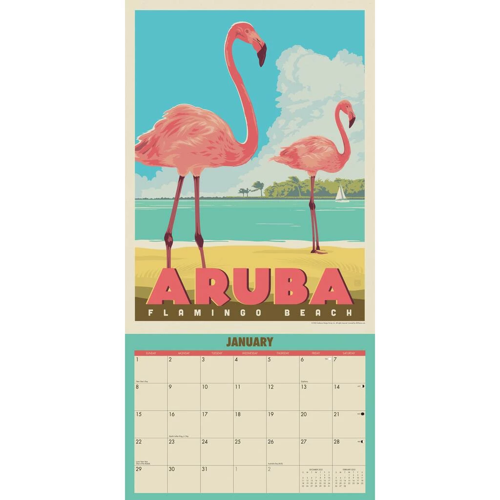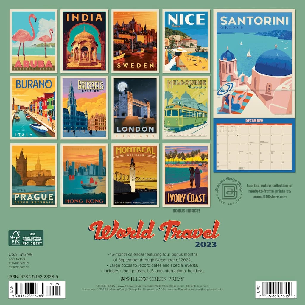 Anderson Design Group’s World Travel deluxe wall calendar showcases iconic sites from around the world, in style. Inspired by vintage poster art from the late 1800s to the mid-1900s, this original art was created to celebrate the world’s great travel destinations. Dramatic perspectives created with vibrant colors and well-crafted lettering add to the retro travel vibe of these posters. Printed with soy-based inks on FSC certified paper, this 12″ x 12″ wall calendar features large monthly grids that offer ample room for jotting notes, along with six bonus months of July through December of 2022. Also includes moon phases (CST), standard U.S. and international holidays.