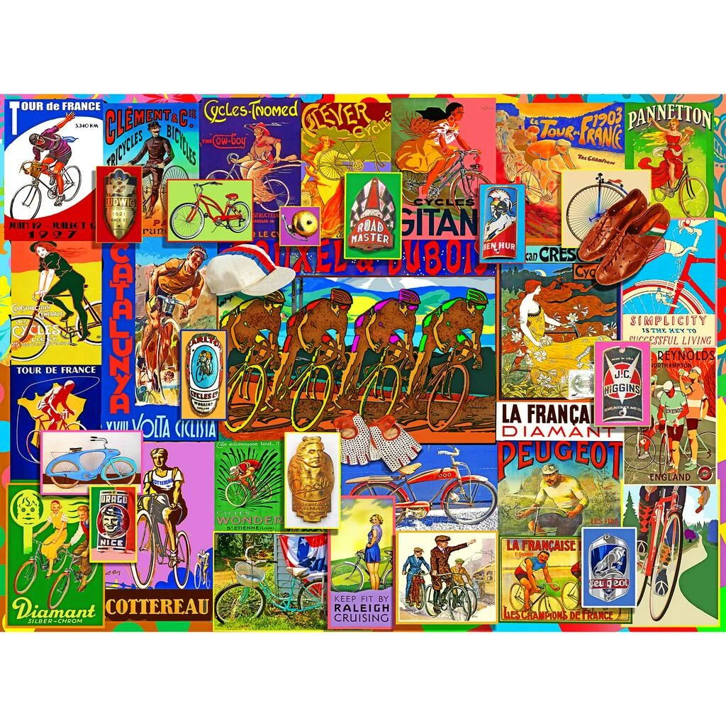 Cycling is the epidemy of speed, strength, and endurance, but even Doris and Fred will be able to keep up with the roadies on this tribute to the road racing elite. Think of it as the Giro d’Italia, Tour de France, and Vuelta a EspaΓ±a all rolled into one colorful, puzzling collage. Proudly made in the U.S.A., this beautiful 1,000 piece jigsaw puzzle features a precision cut image on a high-quality blue board. The fully interlocking pieces are poly-bagged to insure their protection inside the shelf-friendly, 12″ x 10″ box.