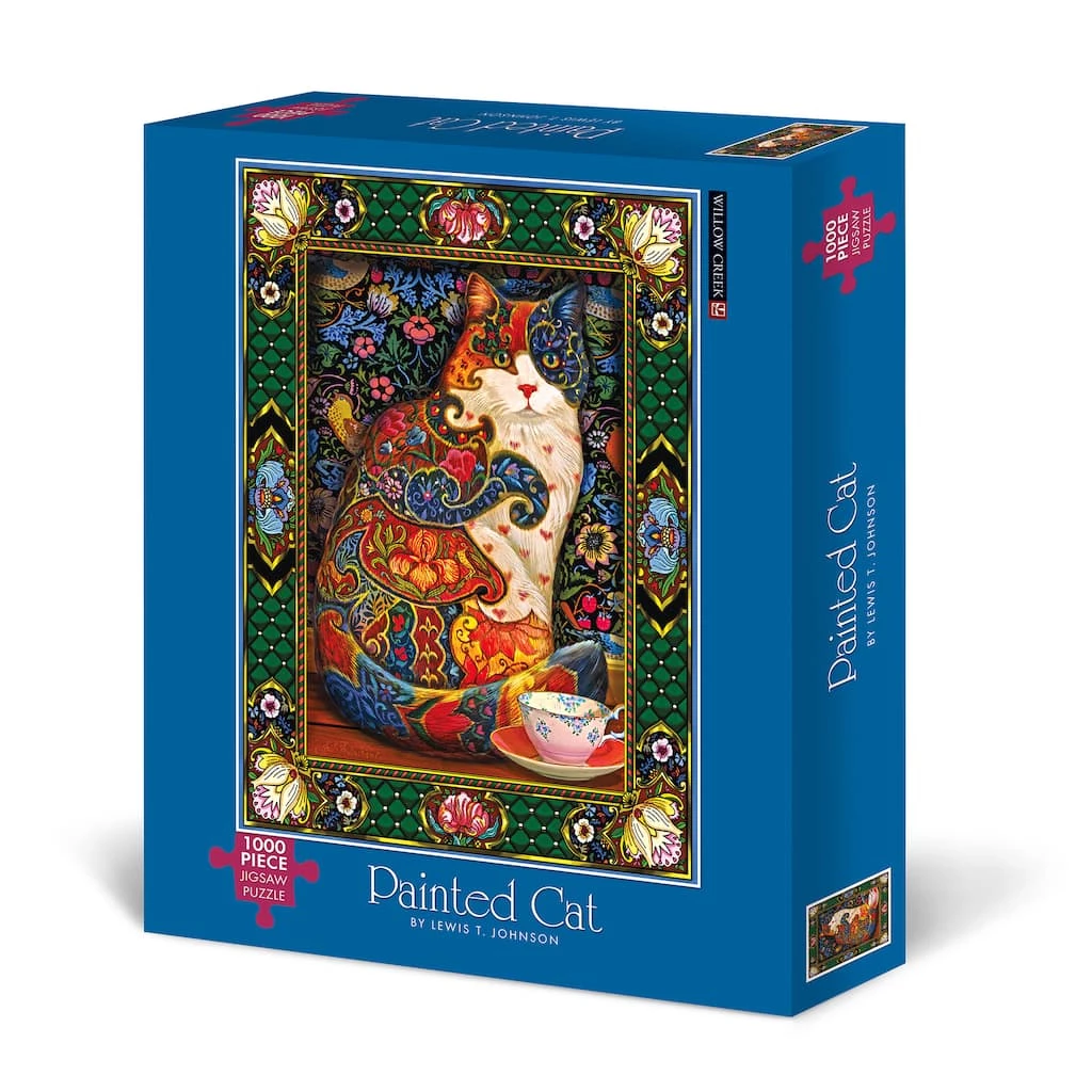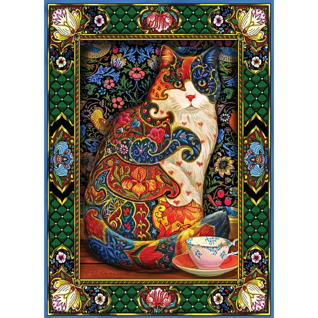 Opulent and ornamental, this highly detailed painting by Lewis T. Johnson features an elegant tabby cat and teacup depicted in a decorative cloisonnΓ© style. A floral tapestry is woven throughout the background, framed by an ornate border, perfect to frame and hang in your home or give as a special gift.