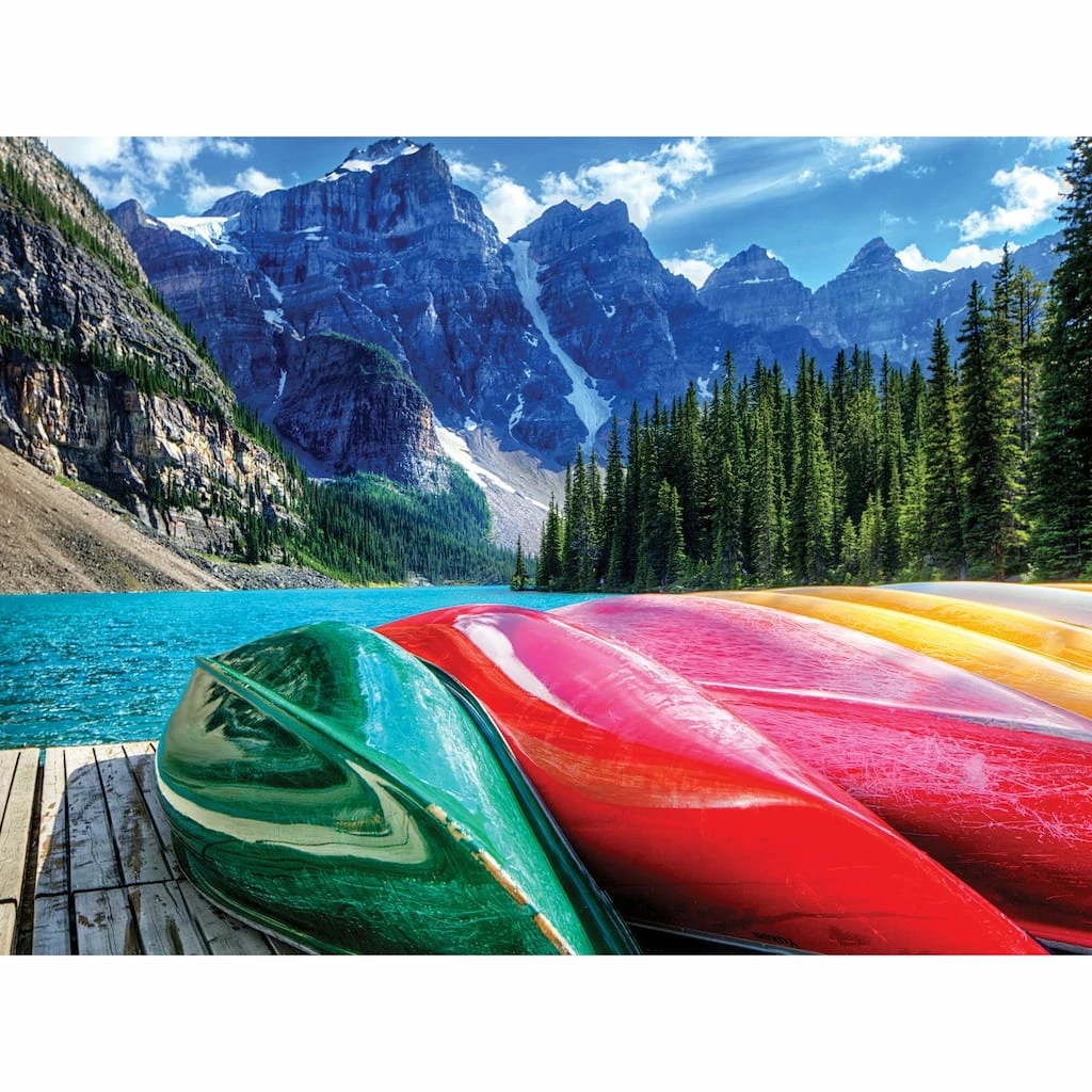 Perched on the dock of a crystal clear mountain lake with an array of candy-coated canoes to choose from and the Canadian Rockies towering in the distance, your adventuresome spirit will never have felt more alive. Proudly made in the U.S.A., this beautiful 500 piece jigsaw puzzle features a precision cut image on high-quality blue board. The fully-interlocking pieces are poly-bagged to insure their protection inside the shelf-friendly, 10″ x 8″ box.