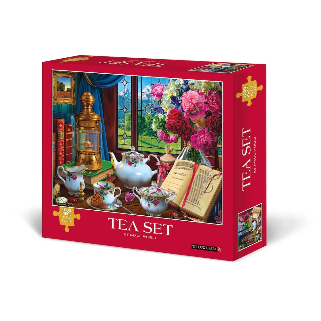 From the gorgeous view of the mountain range peeking through the cut-glass window to the dainty rose-patterned tea set accompanied by Shakespeareβs Sonnets, this elegantly European scene offers an incredible level of detail and nuance that will make this puzzle a favorite for years to come. This delightful 1,000 piece puzzle features a precision cut image on high-quality blue board.Β