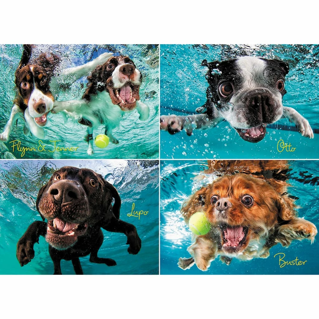 “Seth Casteel’s photos of dogs diving into swimming pools have been a sensation”, says the Washington Post, and “a global phenomenon” according to Wired magazine. When you have clear blue water, googly eyes, and a tennis ball, what more do you need? Get ready to take the plunge with Flynn, Jenner, Otto, Lupo, and Buster. These Underwater Dogs will bring a smile to any puzzler’s face. Proudly made in the U.S.A., this beautiful 1,000 piece jigsaw puzzle features a precision cut image on a high-quality blue board. The fully interlocking pieces are poly-bagged to insure their protection inside the shelf-friendly, 12″ x 10″ box.